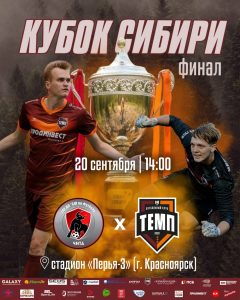 В эту субботу — один из главных матчей сезона! В финале Кубка Сибири сойдутся «Темп» и «Чита»! Мы проделали долгий путь, и остался всего один шаг до звания трёхкратных обладателей трофея! • 20 сентября, 14:00 (по барнаульскому времени) • «Чита» × «Темп» • Стадион «Перья-3», г. Красноярск (ул. Борисова, 6и) Прямую трансляцию матча можно будет посмотреть во «ВКонтакте» по ссылке. Поддержим «Темп» вместе! В финале нужна энергия каждого болельщика! Вперёд, «бордово-оранжевые»!