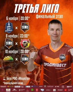 Уже сегодня наша команда отправится на Финальный этап Третьей лиги, где на базе «Мацеста» проведёт три матча в группе С. Расписание матчей: • «Ижевск» (Ижевск) × «Темп» • 6 ноября, 20:00* • База РФС «Мацеста» • «Темп» × «Анри» (Владивосток) • 8 ноября, 23:00* • База РФС «Мацеста» • «СтавропольАгроСоюз» (Невинномысск) × «Темп» • 10 ноября, 20:00* • База РФС «Мацеста» *время начала матчей барнаульское. Болей за команду и присоединяйся к трансляциям — вместе поддержим «Темп» в Сочи!