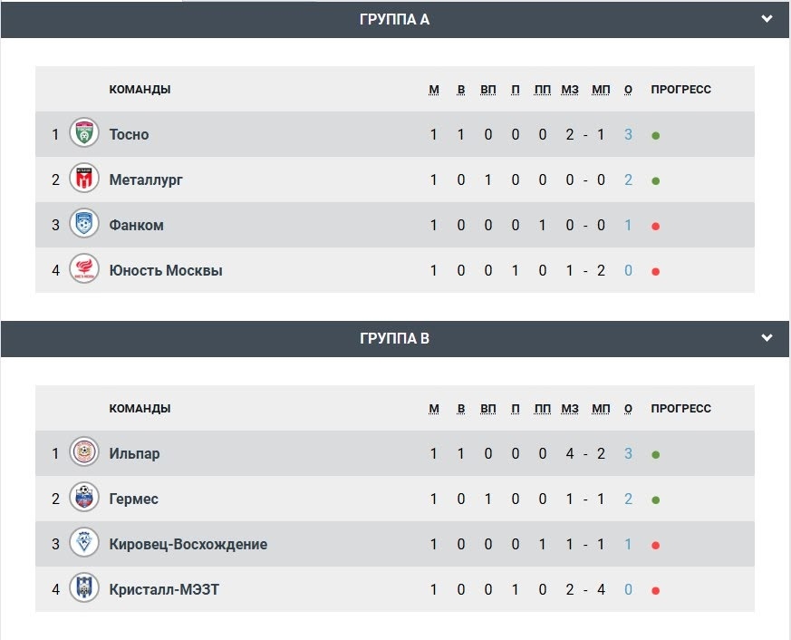 Предлагаем ознакомиться с результатами игр Финального этапа Третьей лиги за 6 ноября! Группа А: • «Металлург» (Аша) — «Фанком» (Киров) 0:0 (6-5 пен.) • «Юность Москвы» (Москва) — «Тосно» (Тосно) 1:2 Группа B: • «Ильпар» (Пермский край) — «Кристалл-МЭЗТ» (Борисоглебск) 4:2 • «Гермес» (Москва) — «Кировец-Восхождение» (Санкт-Петербург) 1:1 (5-4 пен.) Группа C: • «СтавропольАгроСоюз» (Невинномысск) — «Анри» (Владивосток) 2:1 • «Ижевск» (Ижевск) — «Темп» (Барнаул) 5:2 Группа D: • «Шумбрат» (Саранск) — «Красное Знамя» (Ногинск) 1:1 (3-5 пен.) • «Заря-Луганск» (Луганск) — «СШОР 1 Кристалл-Константиновское» (Санкт-Петербург) 4:2
