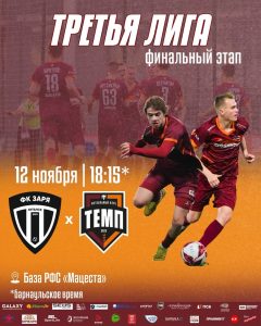 Наша команда впервые вышла в плей-офф Финального турнира в Сочи! Позади остросюжетные схватки и второе место в группе, а впереди суперматч против «Зари-Луганск». На кону полуфинал! • «Заря-Луганск» (Ростовская область) × «Темп» (Барнаул) • 12 ноября, 18:15 (по Брн) • База РФС «Мацеста», г. Сочи Спасибо всем, кто следит и болеет за нас! Вперёд, «Темп»! Продолжаем писать историю!