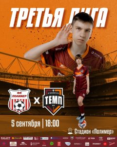 5 сентября «Полимер» принимает «Темп» в матче чемпионата Третьей лиги. Впереди важная игра, и нашей команде очень нужна поддержка трибун! • 5 сентября, 18:00 • «Полимер» × «Темп» • Стадион «Полимер» Если не получится прийти, смотрите прямую трансляцию во «ВКонтакте». А если хочется вместе посмотреть футбол в компании, заглядывайте в «Крафтер». Приходите сами и зовите друзей — вместе поддержим «Темп»!