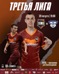 29 августа наша команда в рамках Третьей лиги примет иркутский «Байкал». Нам нужна ваша поддержка, и чтобы трибуны стали настоящим 12-м игроком! • 29 августа, 19:00 • «Темп» × «Байкал» (Иркутск) • СК «Темп» С 18:00 вас ждёт программа для всей семьи: аквагрим, сладкая вата, прохладительные напитки и классные игры! Не получится прийти на стадион? Включайте прямую трансляцию во «ВКонтакте» и болейте онлайн тут. Давайте вместе зарядим команду на победу!